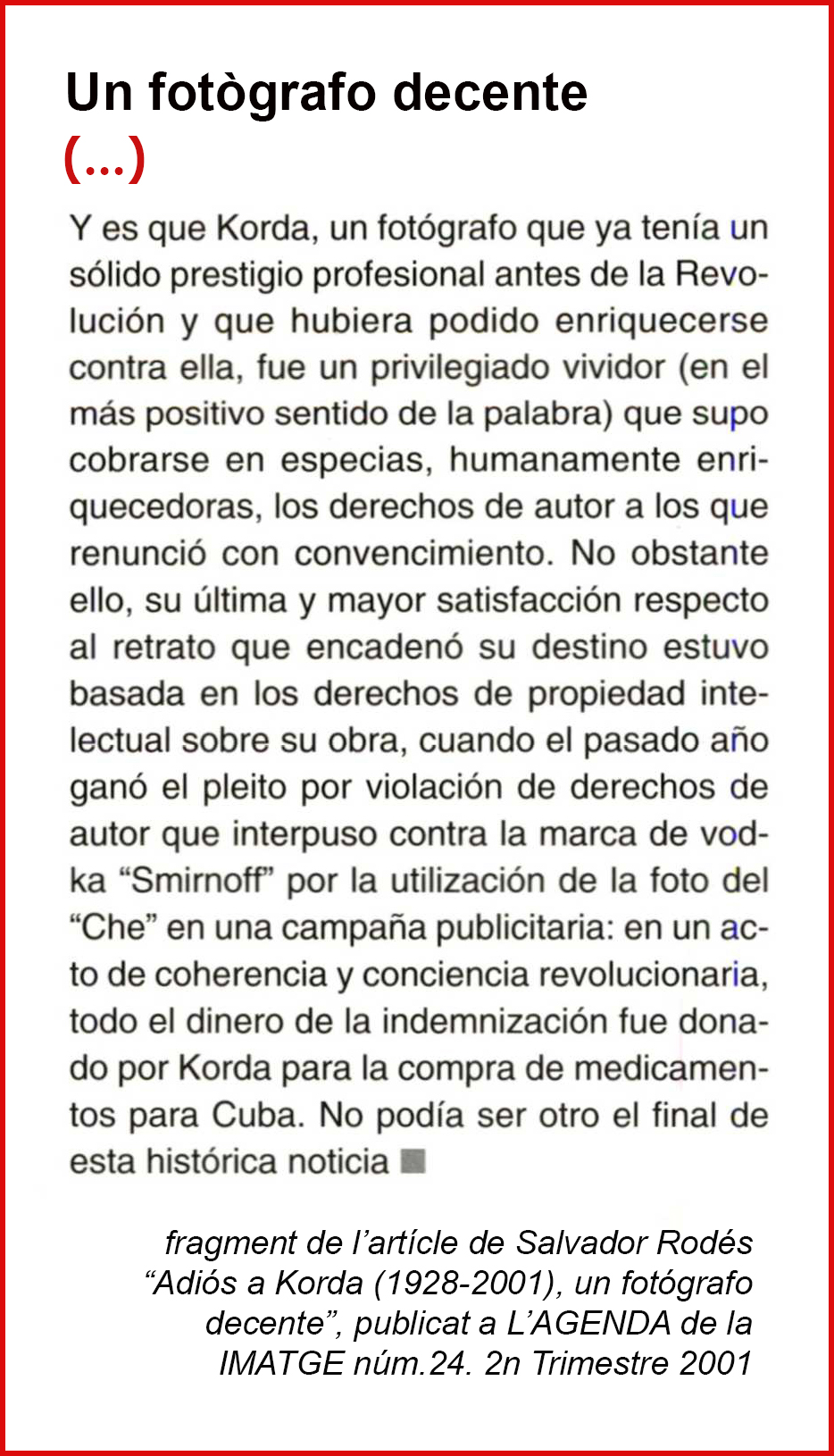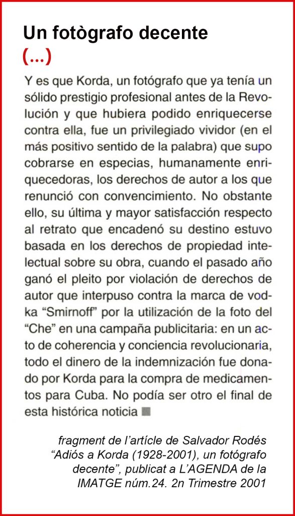 Sabem del seu autor, el fotògraf Alberto Diaz Korda (L´Havana,1928-París,2001) i del context en que va captar la foto gairebé fortuita. Però no sabem per què va romandre durant més de set anys inédita, penjada en una pared del seu estudi fotogràfic, sense que ningú li fes cas.
