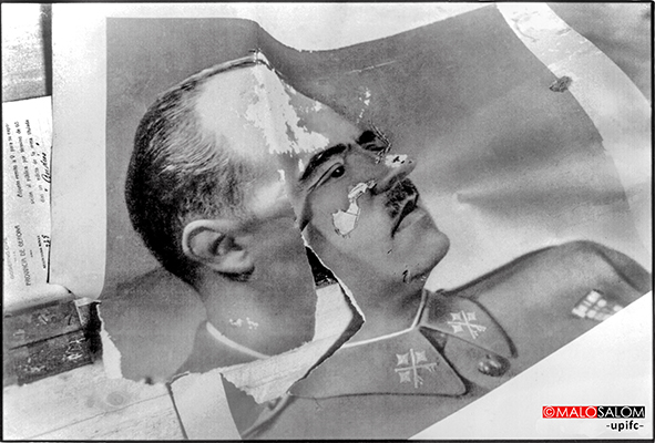 Arxiu ©SALOMFOTO núm. 01380. Dosquers (actualment veïnat de Maià de Montcal, La Garrotxa, Girona), Abril de 1987. Sota el franquisme, els retrats del Dictador i del Papa Pius XII presidien l’escola pública de Dosquers que també es va utilitzar com ajuntament.